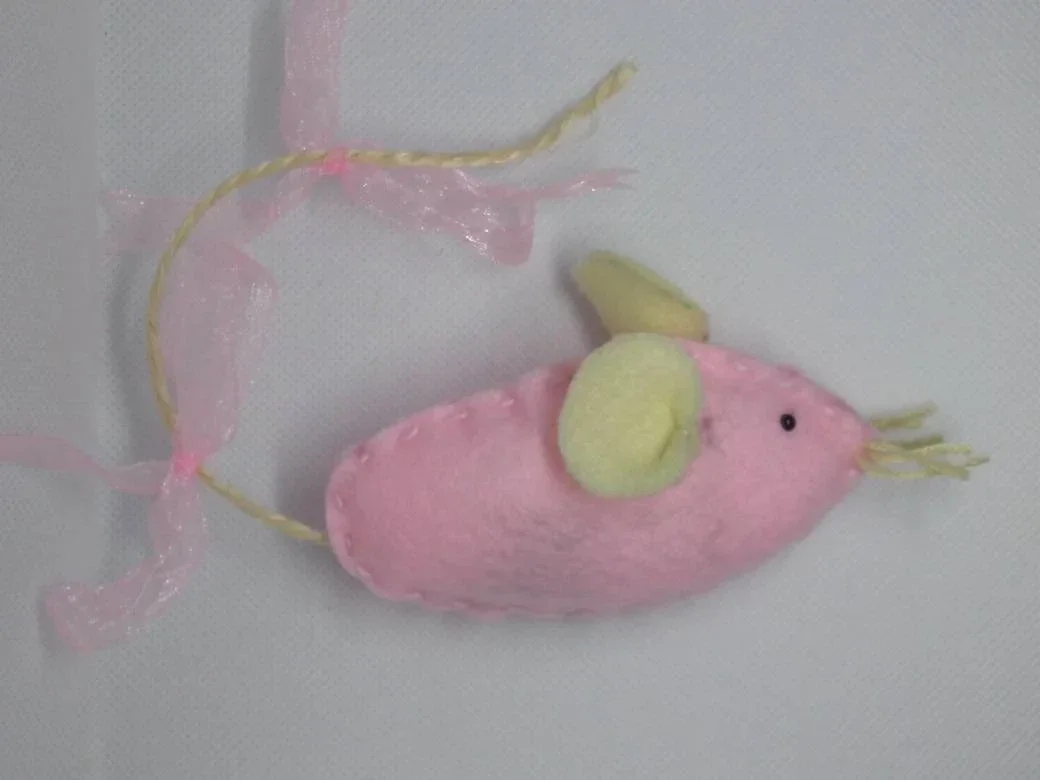 Mouse cat toy is made with felt with added felt and thread detailing, plastic eyes, sisal and ribbons.